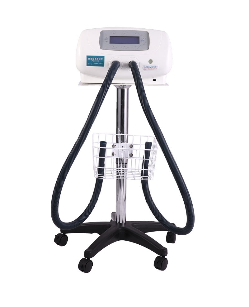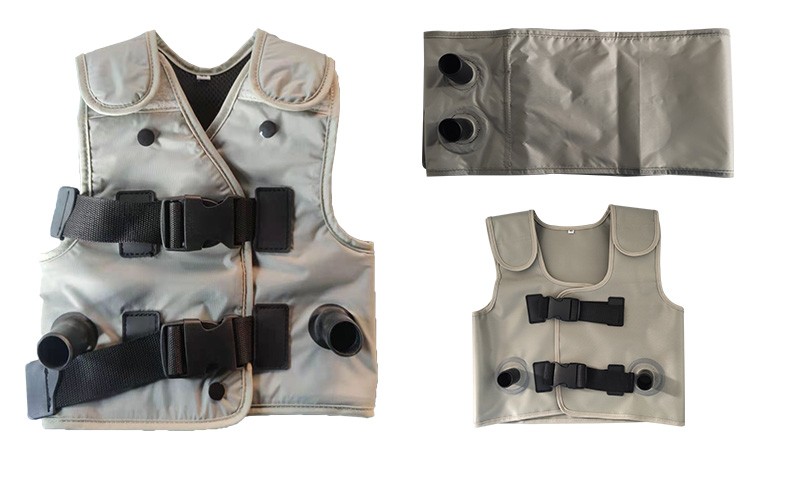 通過模擬正常生理咳嗽的原理,將患者所穿專用充氣背心用導(dǎo)氣軟管連接到高速脈沖泵上,并快速地充氣和放氣,使患者胸壁發(fā)生有規(guī)律的舒張運(yùn)動(dòng),患者氣道和肺部發(fā)生自主的震顫氣流和定向引流力,促使呼吸道粘液及各個(gè)肺葉深部代謝物松弛,液化、脫落;并在定向引流力的作用下將已液化脫落的代謝物按照選擇的方向(如細(xì)支氣管→支氣管→氣管)排出體外。